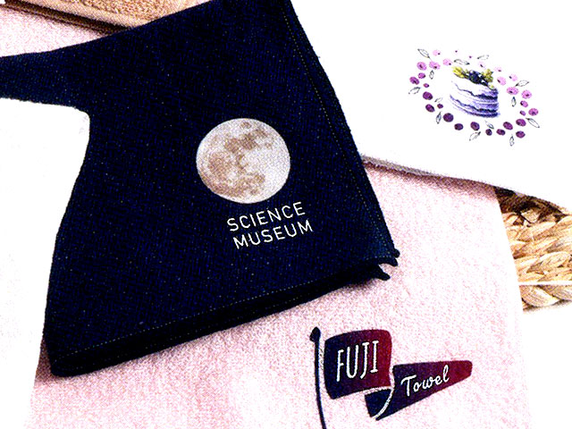 転写紙にプリントしたデザインを熱圧着により生地へ定着させます。1枚からフルカラーで作成ができますが、プリント面は生地の肌触りや吸水性が損なわれます。デザインサイズによりプリント料金が変わります。